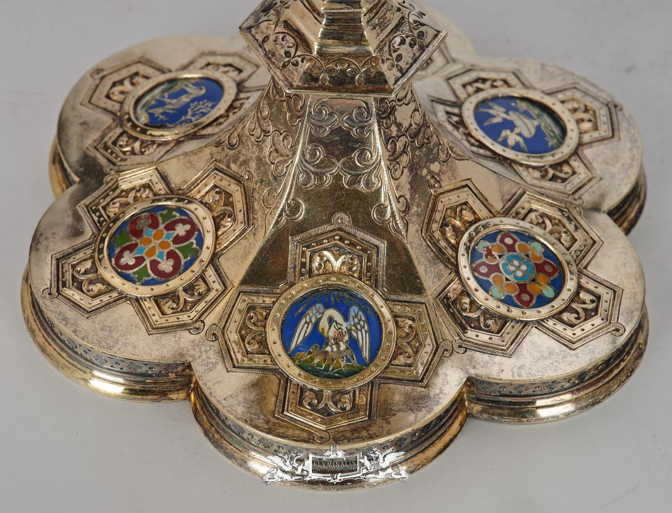 Gilt silver, medallions with champlevé enamel, round shape, socket cover with cruciform finial, height 32 cm, gross weight 748 g, master’s mark, Paris warranty stamp 1838 - 1919.