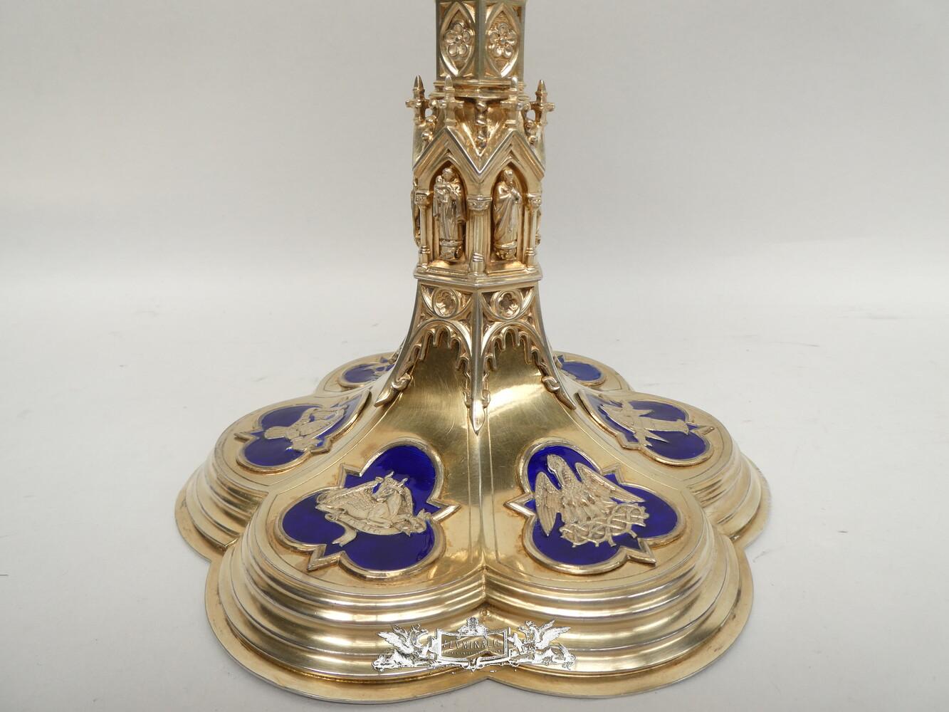 Hight Quality full silver gothic - style chalice with paten. Enamel elements multiple silver figures on the nodus ( St. Louis, St. Peter, St. Paul, St.Nicholas, St. Vincentius ). On the base ( 4 Evangelists / Pelican / Apocalyptic Lamb).