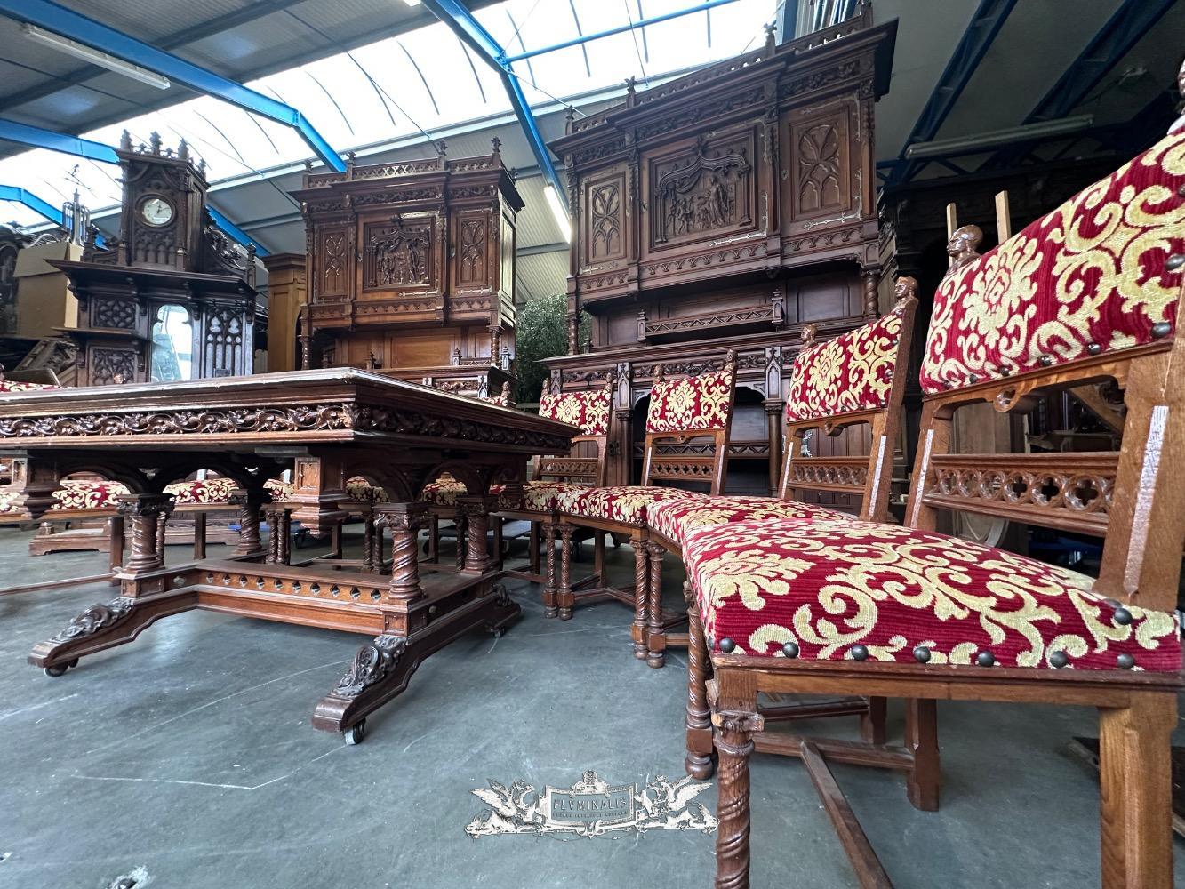 Table Adjustable With Chairs style Gothic - Style en Oak wood / Fabrics, France 19 th century