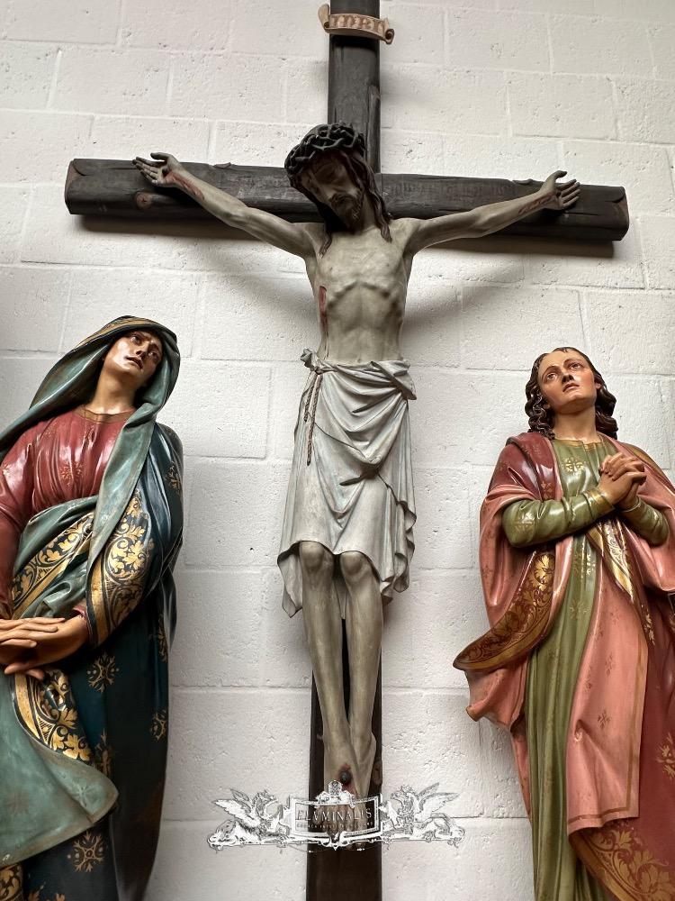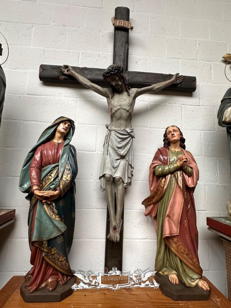 Calvary Scene Corpus Christi St. Mary & St. John style Gothic - Style en Plaster polychrome / Glass Eyes / Wood, Belgium 19 th century ( Anno 1875 )