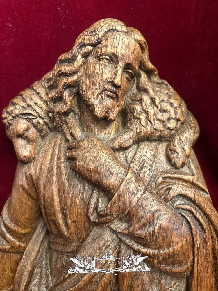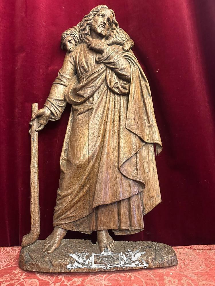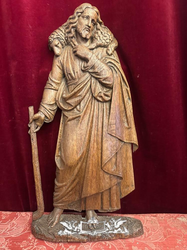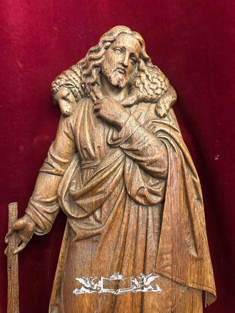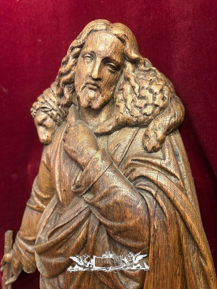 Sculpture Of Jesus 'The Good Shepherd style Gothic - Style en Oak wood, Belgium 19 th century ( Anno 1885 )