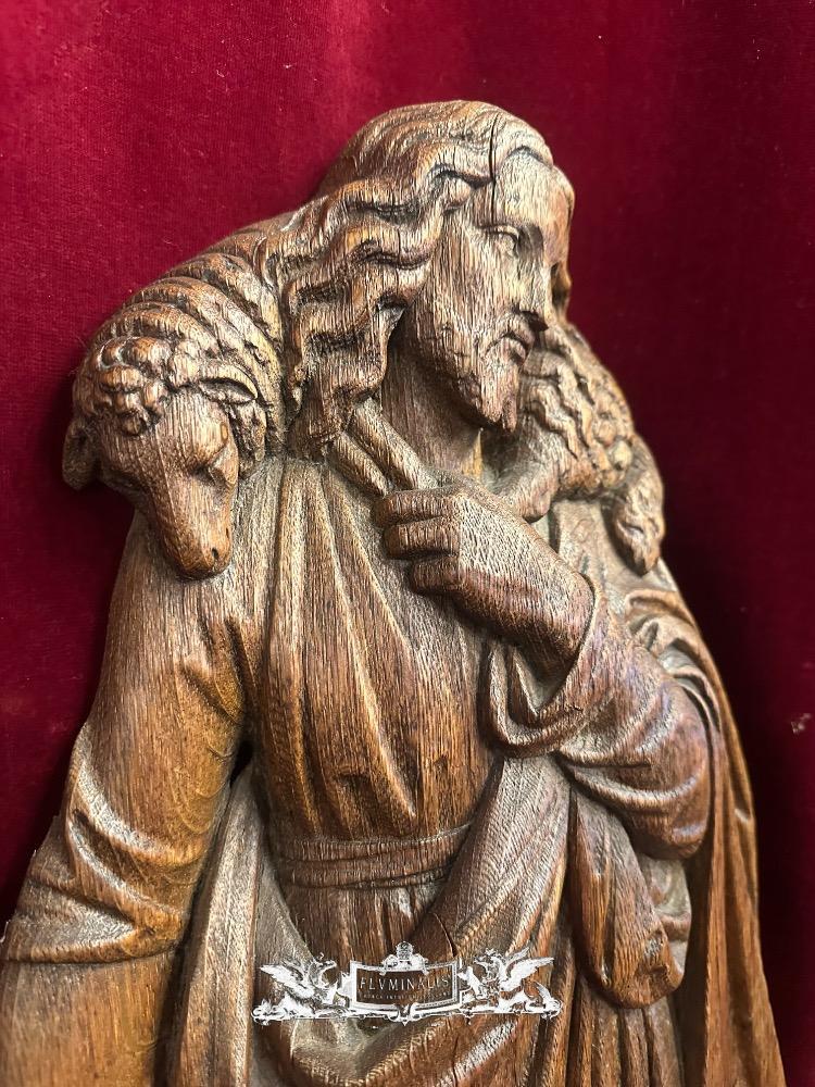 Sculpture Of Jesus 'The Good Shepherd style Gothic - Style en Oak wood, Belgium 19 th century ( Anno 1885 )