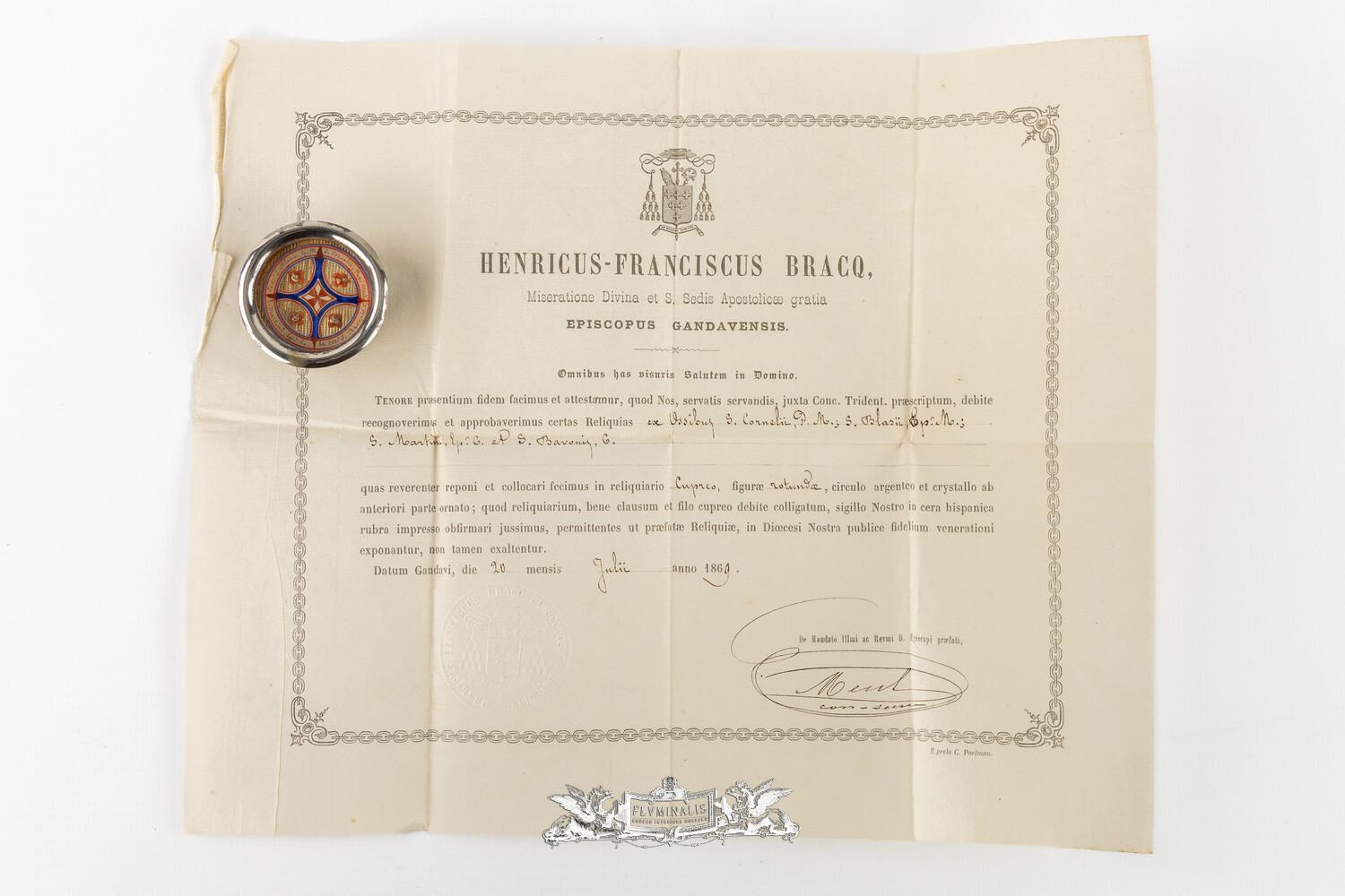 Multi Reliquary Ex Ossibus Relics : S. Cornelii Pap,S. Blassi Ep, S. Martini Ep, S. Bavonis C. With Original Document en Brass / Glass / Wax Seal, Gent - Belgium 19 th century ( Anno 1869 )