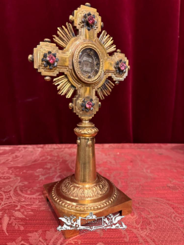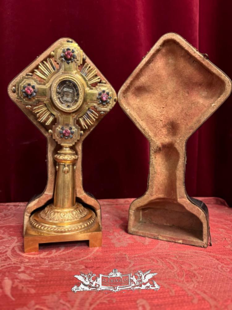 Reliquary - Relic Ex Ligno S. Crucis D.N.J.C. With Original Case en Bronze / Gilt / Stones / Glass, Italy 19 th century ( Anno 1875 )