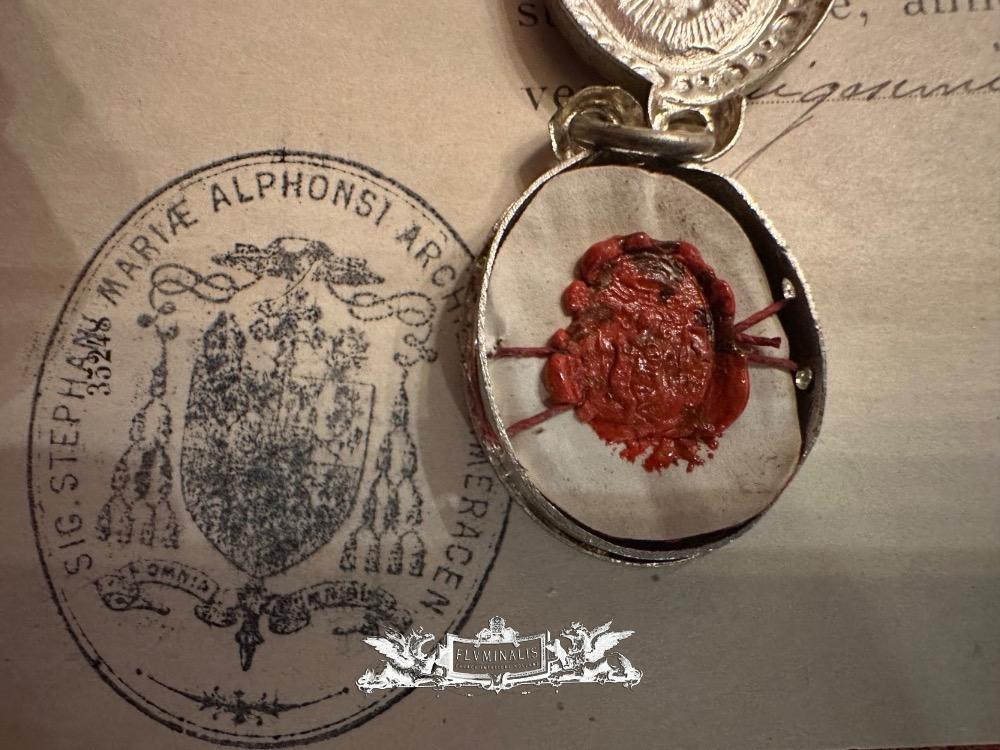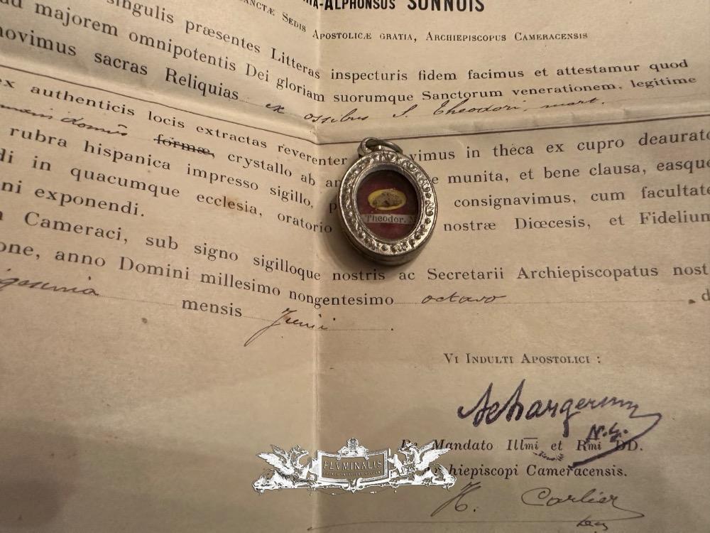 Reliquary - Relic Ex Ossibus St. Theodorus With Original Document en Silver / Glass / Originally Sealed, France 20 th century ( Anno 1908 )