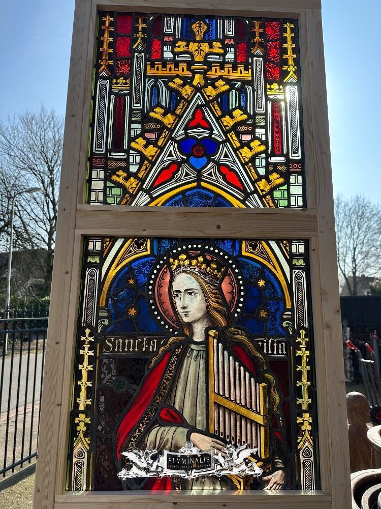 Stained Glass Window St. Cecillia style Gothic - Style en Glass, Belgium 19 th century ( Anno 1865 )