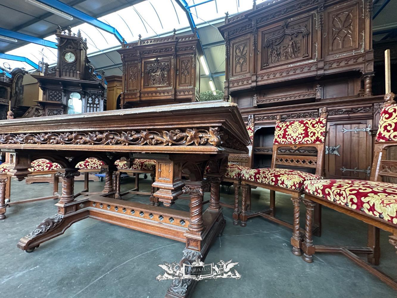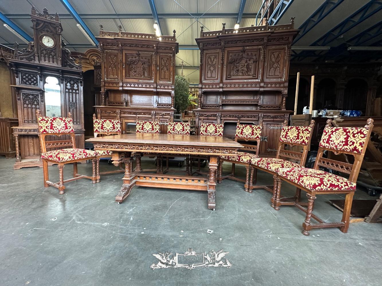 Table Adjustable With Chairs style Gothic - Style en Oak wood / Fabrics, France 19 th century