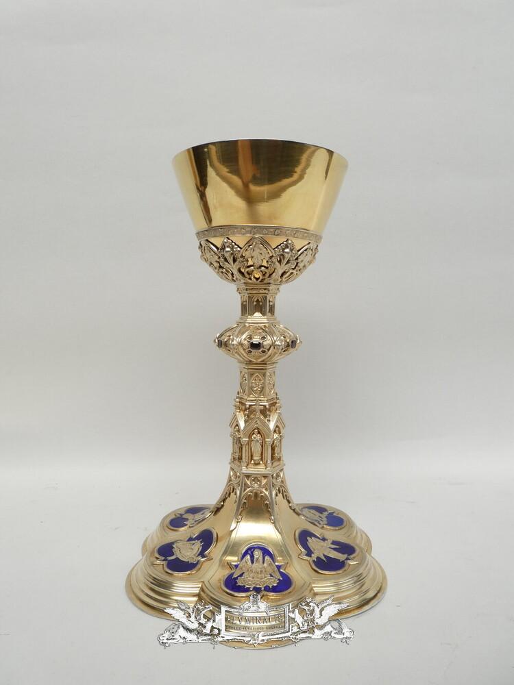 Hight Quality full silver gothic - style chalice with paten. Enamel elements multiple silver figures on the nodus ( St. Louis, St. Peter, St. Paul, St.Nicholas, St. Vincentius ). On the base ( 4 Evangelists / Pelican / Apocalyptic Lamb).