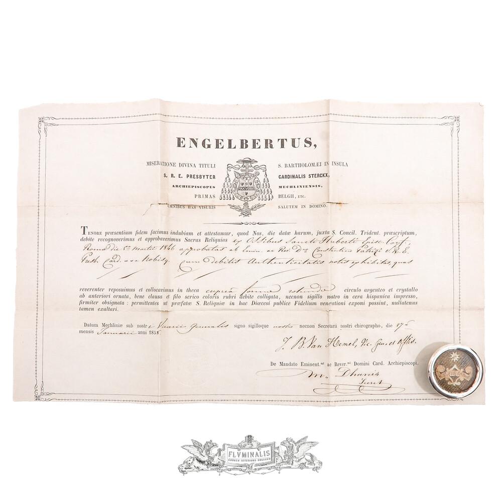 First Class Reliquary - Relic Ex Ossibus St. Hubertus With Original Document en Brass / Glass / Wax Seal, Belgium 19 th century