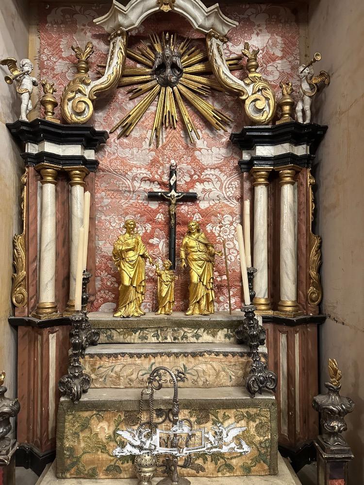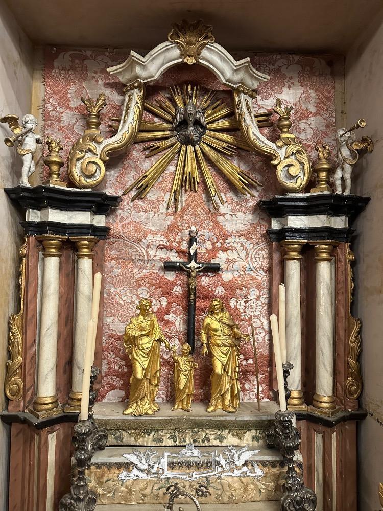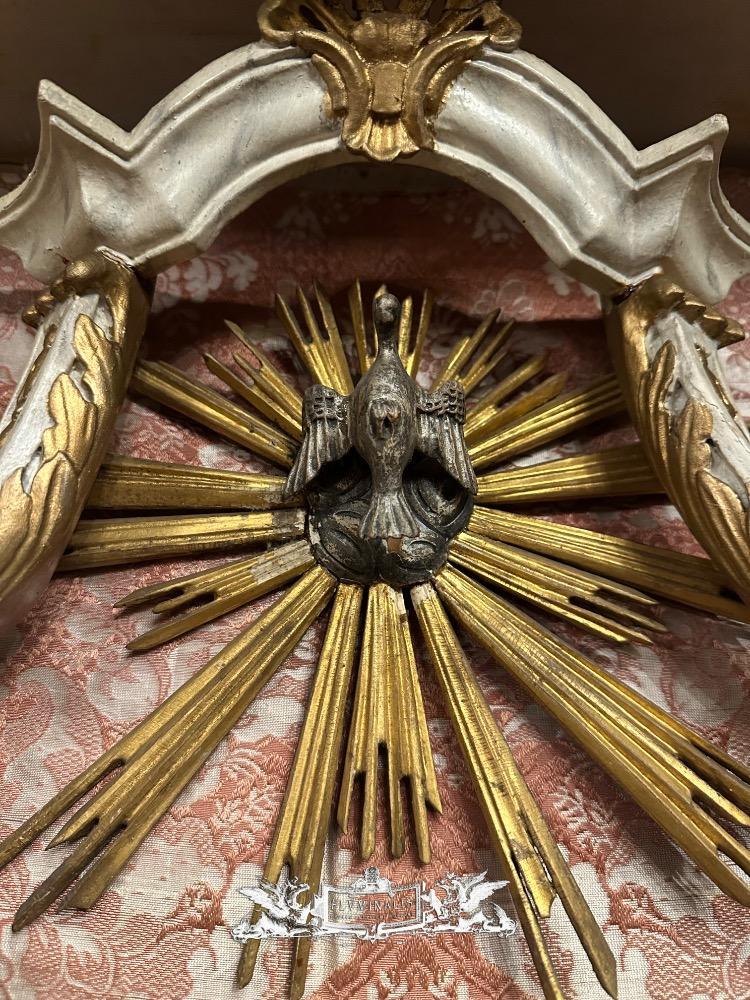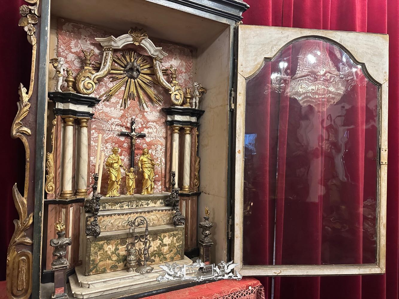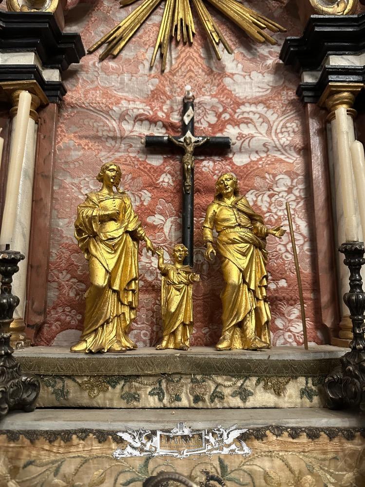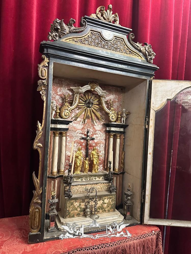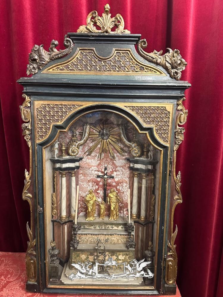 Holy Family Devotion - Shrine en Fully Handmade / Hand - Carved Wood / Glass / Fabrics, Spain 19 th century ( Anno 1825 )
